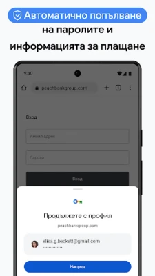 Живейте свързано с Google Chrome, където вашите данни са винаги с вас, независимо от устройството. С функцията за синхронизиране между устройства, всички ваши отметки, отворени раздели и запазени пароли се достъпват лесно и мигновено от вашия телефон, таблет или компютър, когато сте влезли в профила си в Chrome. Организирайте своето дигитално пространство с Групи раздели, които ви позволяват да групирате свързани страници и да поддържате прегледност между различните си задачи и устройства. Спестете ценно време с автоматичното попълване на данни – вашите запазени начини на плащане, адреси и пароли се попълват автоматично, правейки онлайн пазаруването и влизането в профили бързо и безпроблемно.