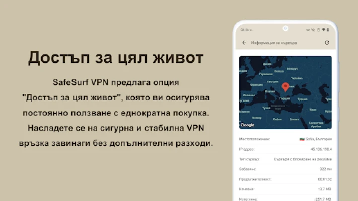 Отключете пълния потенциал на интернет с глобалната сървърна мрежа на SafeSurf VPN. Свържете се безпроблемно с най-добрите сървъри по света, за да заобиколите географските ограничения и да се насладите на стабилна и бърза връзка, независимо къде се намирате. Независимо дали става въпрос за стрийминг, игри или работа, SafeSurf VPN ви дава свободата да достигате до желаното съдържание без компромис. А за тези, които търсят дългосрочна сигурност, опцията „Достъп за цял живот" предлага еднократна покупка за постоянен, безгрижен достъп до всички функции на SafeSurf VPN, без скрити разходи. Изживейте истинската свобода и спокойствието, които заслужавате в дигиталния свят.